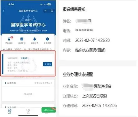 第三步:报名信息提交后报名成功。点击详情可检查一下报名明细。注意重新报考按钮点击后当前报名会被重置。若发现小程序首页没有报名结果需要重新点击开始报名,如考生服务系统绑定了微信,医考中心的公众号会主动推送报名提示信息。通过网站考生服务系统报名和通过微信小程序报名是同步信息的,两选一即可。