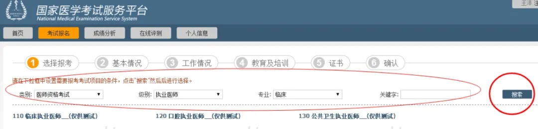开始报名后,首先需要选择报考考试科目(医考考试即为考试类别/级别)。由于考试科目繁多,用户可通过设置页面顶部的筛选条件进行检索。在下方检索结果中选择要报考的项目,单击「报名」按钮开始报名。在完成报名的过程中可以通过页面右上方的导航按钮「上一步」「下一步」来实现各个步骤的跳转。系统将默认提取个人信息中的对应数据自动填充报名所需栏目,当内容不够完整时则需要用户手动补充报名内容,在填报的同时需要注意每一个环节导航区域的填报提示。2. 基本情况