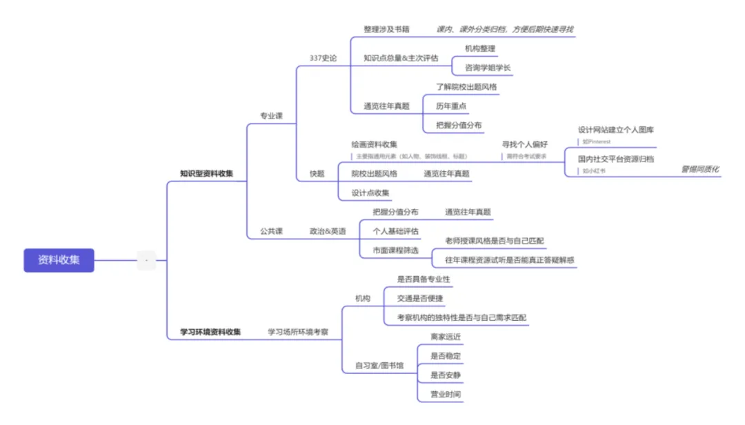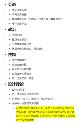以我自己举例,在资料基本收集完毕后,我对照自身情况进行了大致评估。通过分析,我发现在四门科目中我的设计史整体都较为空白,因此我的重点学习目标是优先构建设计史论知识体系,快速拉平四门考试科目的整体进度,不让337拖后腿;在大致浏览完历年英语一真题难度后,我认为不需要在阅读和写作上消耗过多时间,重点应该在单词拓展;收集资讯时我发现关于考研政治要分配多少精力众说纷纭,在分析完大纲和考试重点后,结合自身的基础和短期记忆力,我最终决定接近10月初才正式启动政治......诸如此类,在分析情报时一定要结合自身情况,不要盲目照搬。