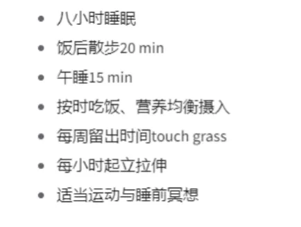 一般而言,这个阶段的考生很可能面临一种身心俱疲的状态,健康管理是相当重要的,一定要远离熬夜复习等为身体造成负担的行为。在冲刺阶段,我的健康管理主要包括以下清单: