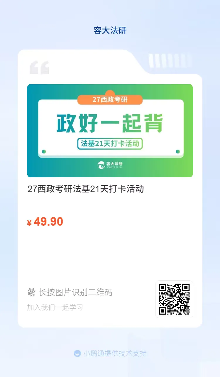 有不少同学向南南或西西咨询:想要备战27考研,却不知如何着手;也担心备考初期缺少研友和监督,迟迟难以进入复习状态。还有一些已经开始复习的同学,面对笔记上的难点感到困惑,或觉得进度缓慢;此外,很多同学也期待能在假期组队学习、彼此督促——在认真调研大家的需求后,我们正式推出了西政考研「政好一起背」法基21天打卡活动!