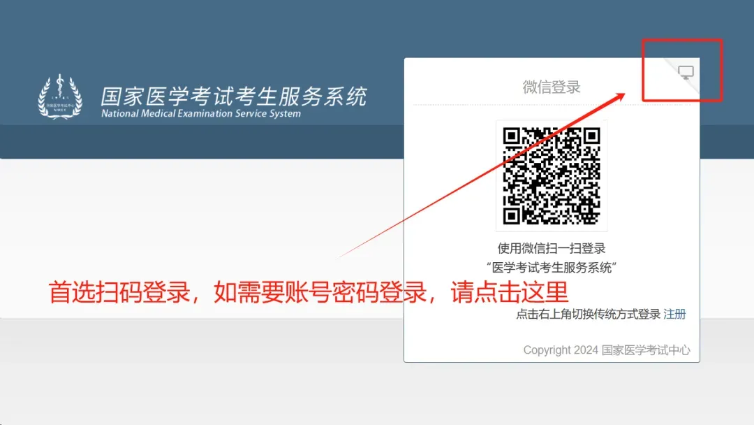 ① 登录国家医学网:使用微信扫描快速登录,该功能将有效减少因帐号或密码遗忘而造成的不便。首次使用时须与考生服务系统登录帐号和密码进行绑定(一个微信号只能绑定一个帐号),绑定成功后即可实现扫描一键登录系统。(报名成功后微信公众号会有报名成功的提醒)注意,后面线上审核子平台的账号密码,也是这里的账号密码!