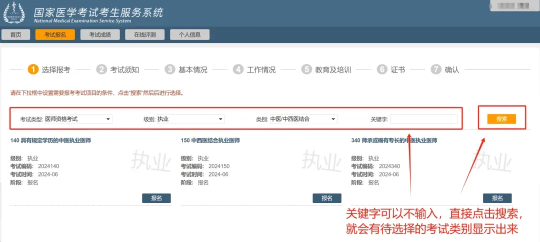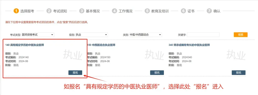 ②进入后,点击考试报名,进入报名系统。开始报名后,在“国家医学考试考生服务系统”这个页面,先把右侧栏的重要通知看一遍,这里面关于填报步骤,相关文件说明,照片检测工具,照片处理工具,都有。自己先要把该看该熟悉的东西,先自己了解,不要觉得什么都可以私信问一下。私信微信:liusongCQ③点击“开始新的报名”进行报名信息的输入。报名通道关闭后不提供信息修改功能,请务必在报名时间内检查自己所报考的考试科目,考区/考点是否正确;如发现报考有误,在网上报名期间,可通过报考项目方框右下方的“放弃报考”予以放弃,然后重新“开始新的报名”进行报名。④进入后按照选择报名信息:报考(类别、级别、专业)→考试须知→基本情况→ 工作情况→教育与培训→ 证书→确认的流程进行搜索出报考对应内容,点击报名:中医类选择:医师资格考试,然后选择执业/助理,再选择中医/中西医结合,然后选择自己的类别,注意不要选错:⑤查看报名须知,了解完毕后点击“同意并继续”。在完成报名的过程中可以通过页面右上方的导航按钮“上一步”、“下一步”来实现各个步骤的跳转。显示确认是自己报名的考试项目后,点击报名按钮进入下一步。进入考试须知界面,认真阅读并同意后,点击“同意并继续”按钮。若在个人信息完善中尚未上传照片,则在基本情况一组中需要注意完成照片上传(照片要求为jpg格式文件,不要大于40k)。
