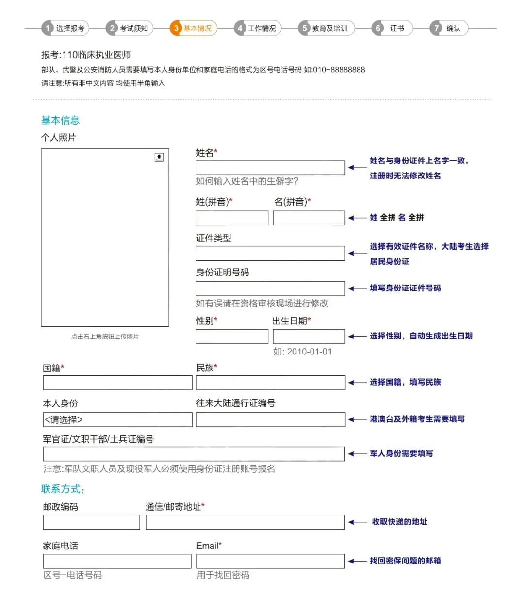 处理后,再导入“照片检测工具”,进行检测,最后得到合格的照片。但是说实话,这个软件也不是很好用。不会弄就去门口照相的小店去叫专门的人弄,或者私信我修改微信:liusongCQ现场审核照片和网报提交的照片保持一致,如果是老考生,建议更新近期的照片(你没有隆过鼻,没有割过双眼皮,没有拉过脸皮,没有暴瘦暴肥)。提交的照片后面作为资格证证书照片用。所以大家这个照片照漂亮一点,资格证上用的。完善个人身份信息,千万注意核对姓名、性别、身份证号、民族等关键信息,与注册密切相关,如果错误,只有国家卫健委才能修改,非常麻烦。完成后直接点击下一步。3.证件类型:大陆考生选居民身份证,其他考生选对应项;工作情况是填写可以开具试用期考核证明的单位。