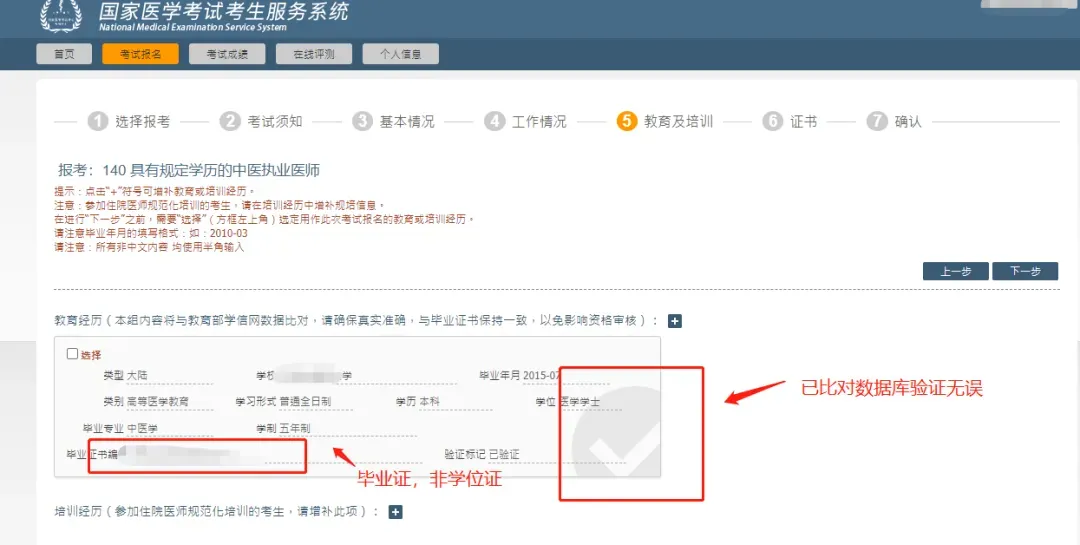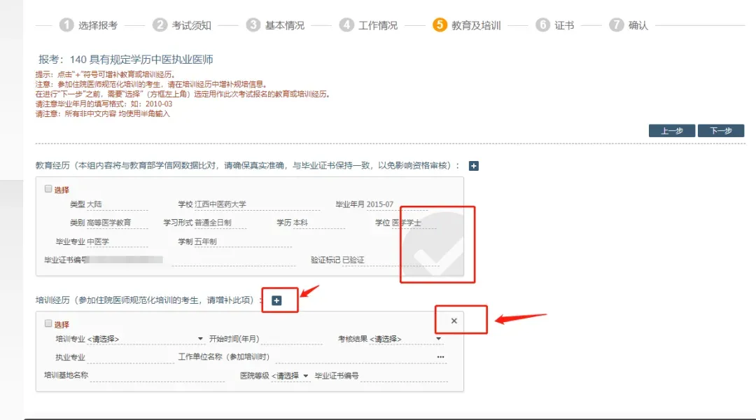 4.全部填写完成后,在左上角【选择】二字后勾选复选框,点击下一步即可。1.类型:大陆,注意港澳台及境外学历需要国家留学认证中心的认证报告,且专业学制符合报名规定;2.学校:点击 “•••”点进行关键词搜索,然后勾选;师承及确有专长填“-”;3.毕业年月:请按照报名毕业证书的颁发日期填写;师承及确有专长填“-”;4.类别:高等教育包含“大专和本科”;中等教育就是“中专”;师承和确有专长直接选;5.学习形式:根据实际就读学校的招生属性进行选择;8.专业:系统内搜索查找与毕业证上专业完全一致的专业;10.毕业证书编号:填写毕业证书上的编号,师承及确有专长填“-”(特别注意:大专和本科学历编号填写错误审核时学信网会报错)。