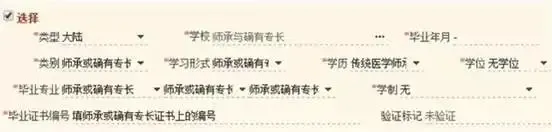 1.当年毕业研究生可不用输入毕业证书编号师承或确有专长者可不用填写毕业证书编号。师承人员,在学校中选择师承及确有专长,毕业年月及毕业证书中都填写“-”即可。
