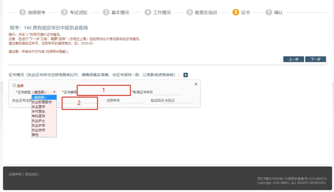 ⑨填写已获证书情况,注明证书类型、编号及发证时间。证书,这里添加的是已有助理医师资格证书的情况,助理升执业的考生,请务必填写,直接考执业或者直接考助理的就跳过,不需要填写!其中资格证号码数字多,执业证号码数字少,一般241开头。点击右上角“下一步”。