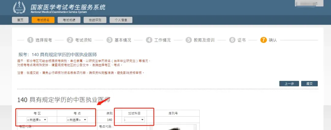 在医师资格考试报名中,用户若以中专学历报考执业等级考试科目,需要提供“执业助理医师“证明,其他情况此环节可以直接跳过。证书的选择方式同教育/培训经历。若在个人信息中未能完善相应的证书信息,可在此处通过栏目标题右侧的“+”按钮进行添加。提交前请认真检查刚刚报名时填写的各项信息是否有误,确认无误后点击提交按钮。注意,“学校”填写时,如菜单中没有相应的院校名称,则需申请添加数据,请按系统提示登陆相关链接进行相应的操作。考生可待后台数据库添加成功后在菜单中选择。“毕业证书编号”填写18位电子注册号,毕业证书编号指考生毕业证书上的统一编号,不足17位的由左向右逐一填写;且证书编号必须输入数字。