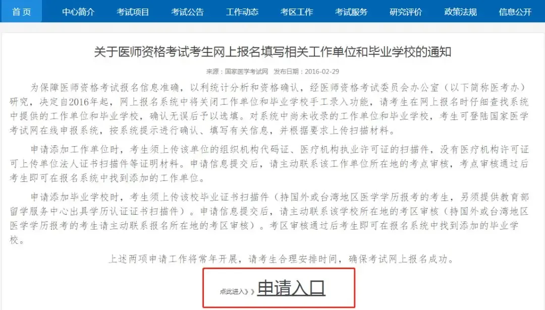 这个工作单位就是开实习证明的这个单位,在确定单位前网报和现场确认提交的考核证明的这个单位要保持一致!!!一定要注意,我之前说的几个大原则:如报名时找不到自己的试用机构,应先通过申报系统提交医疗机构的材料申请增补。请各位考生根据以下步骤提交申请。