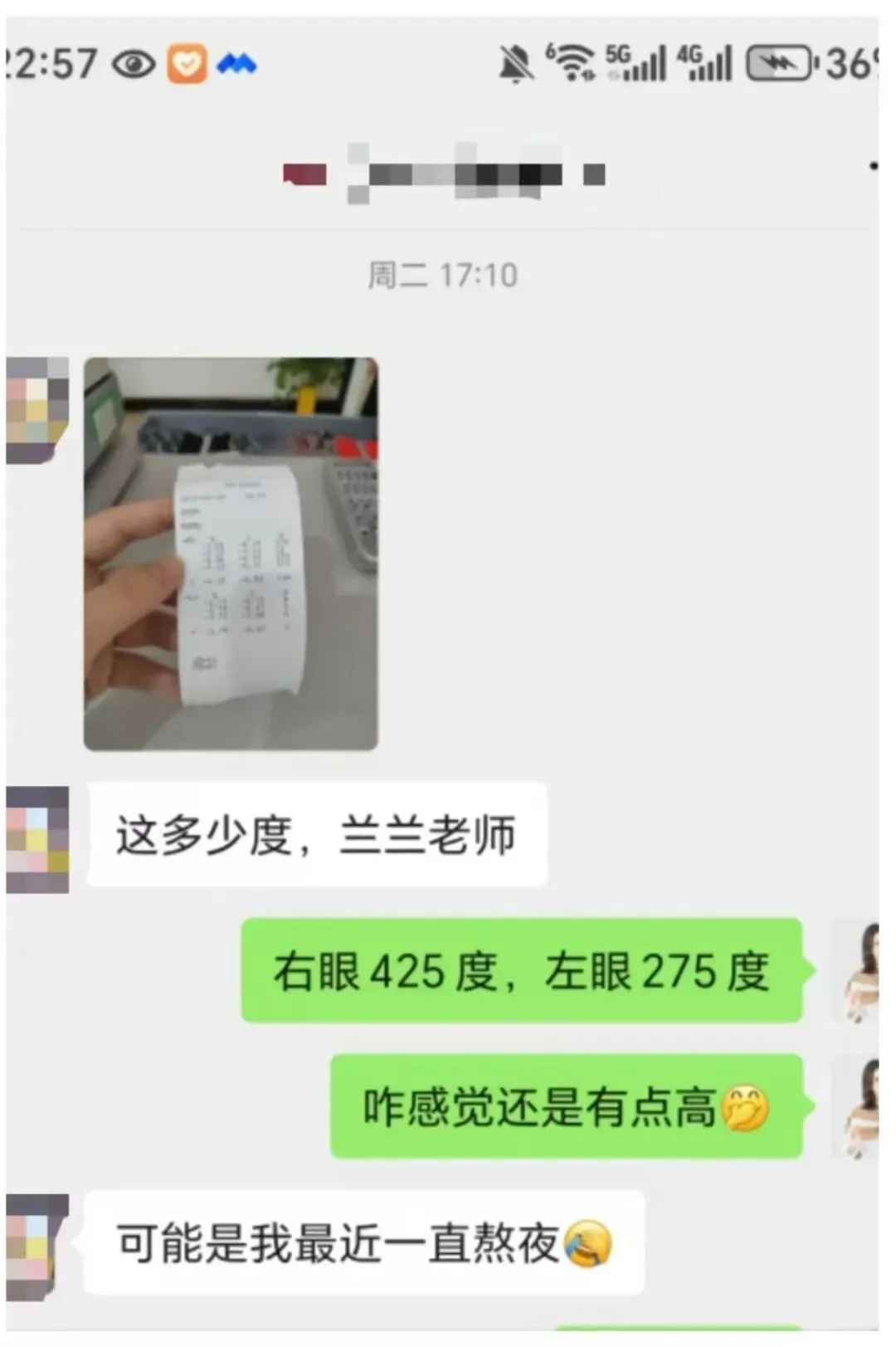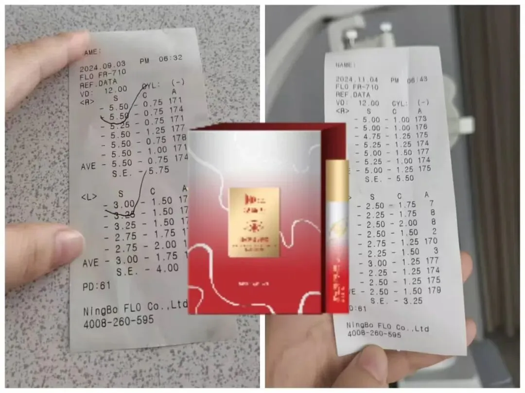 原来左眼400度近视,100度散光;右眼575度近视,175度散光。仅仅用40天,就已经明显下降。