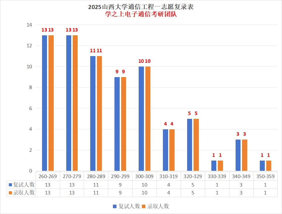 专硕(通信工程085402)复试线为 260 分,一志愿70人进入复试,录取 70人,其中录取最高分 350 分、最低分 260 分、平均分 291 分。