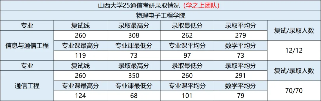学硕(信息与通信工程081000)复试线为 260 分,一志愿12人进入复试,录取12人,其中录取最高分 308 分、最低分 262 分、平均分 279 分。