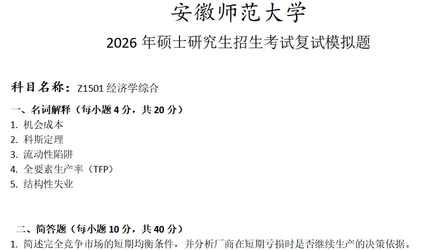 >安徽师范大学Z1501经济学综合考研复试真题模拟
