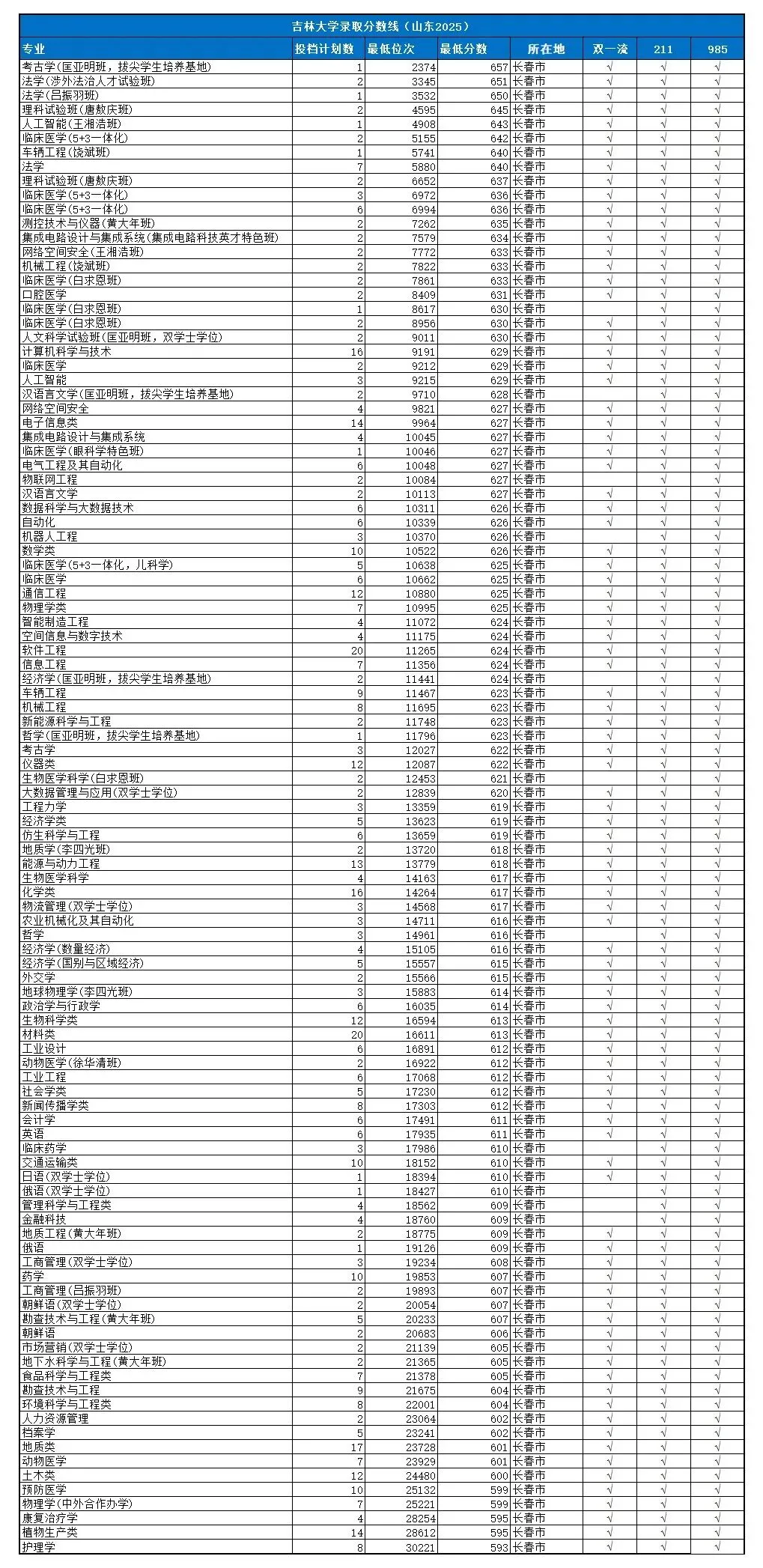 2025年在山东各专业录取情况: