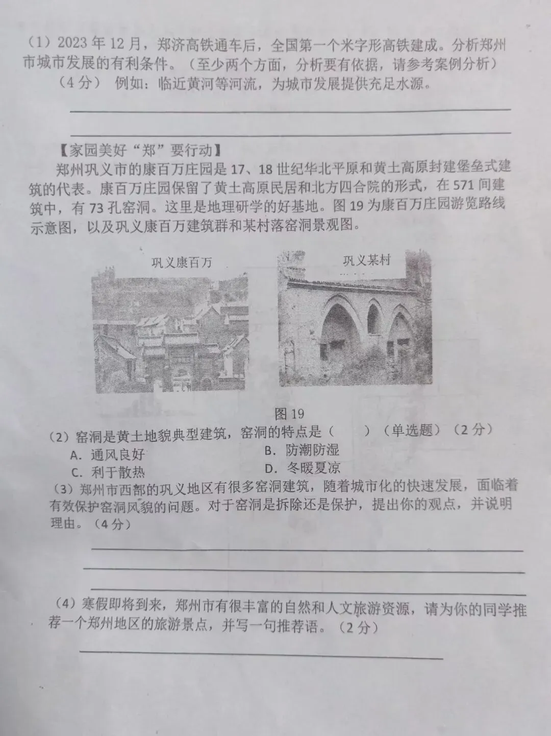 母女的对话,让我想起了上午在朋友圈里看到的一个做自然教育而又热爱传统文化与环保的落羽彬老师分享的七年级期末考试地理试卷: