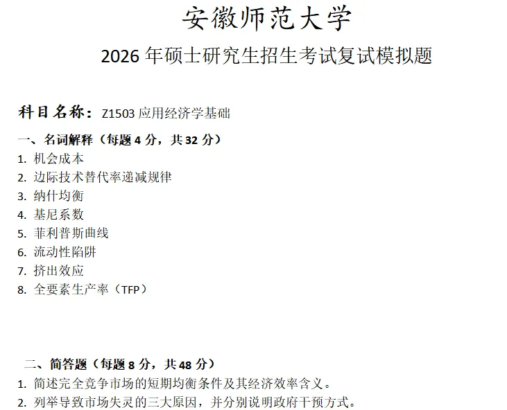 安徽师范大学Z1503应用经济学基础考研复试真题模拟