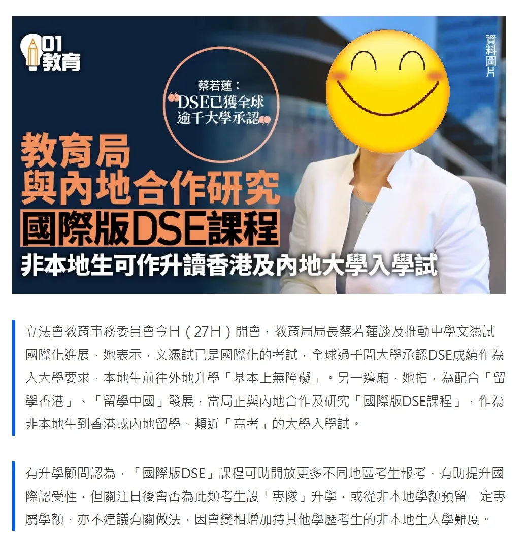 1月27 日,香港立法会教育事务委员会举行会议,教育局局长蔡若莲在会上公布多项教育领域重磅举措。其中,与内地合作研究「国际版 DSE 课程」、提升非本地生招生上限等政策,不仅将推动香港文凭试(DSE)进一步国际化,更将为全球学子赴港或赴内地升学开辟新路径。