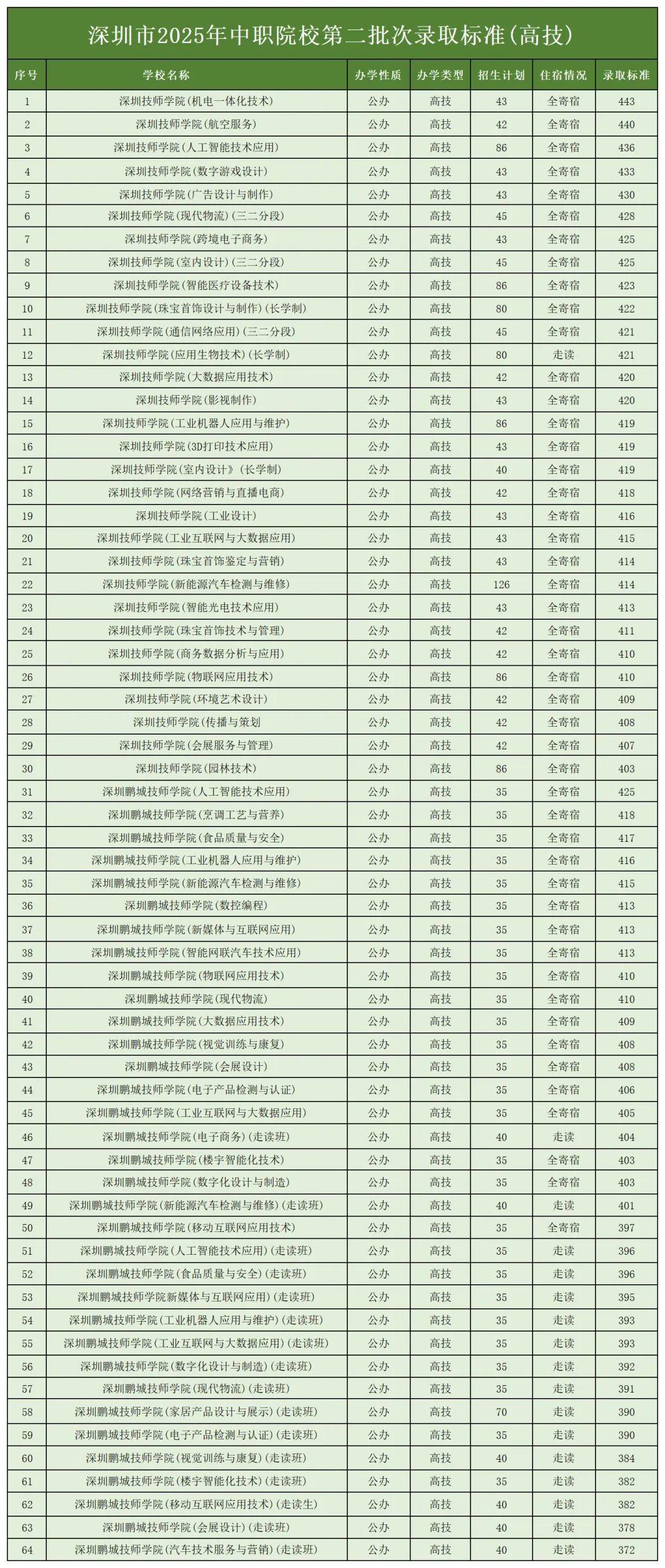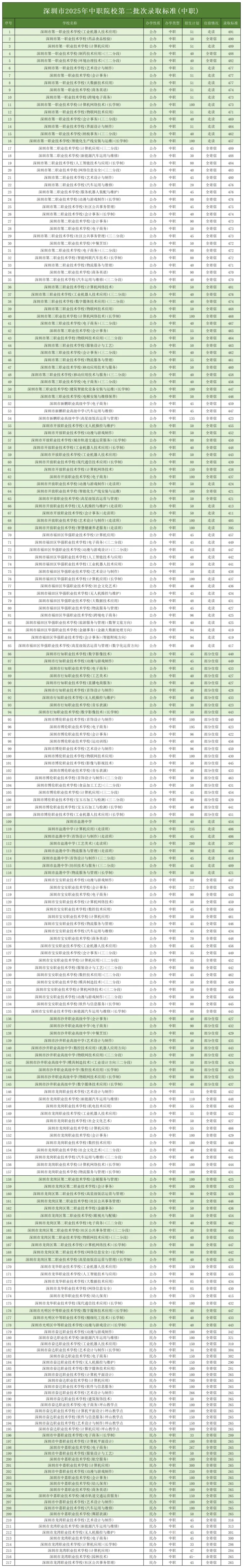2025年深圳共29所中职技工类学校参与中考招生:15所公办中职、3所民办中职、2所高技(公办)、9所中技(民办),各校各批次专业录取分数线汇总如下。