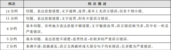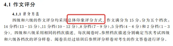 作文满分为15分,分为5个档次:14分档(13-15分)、11分档(10-12分)、8分档(7-9分)、5分档(4-6分)和2分档(1-3分)。四级和六级采用相同的档次描述。