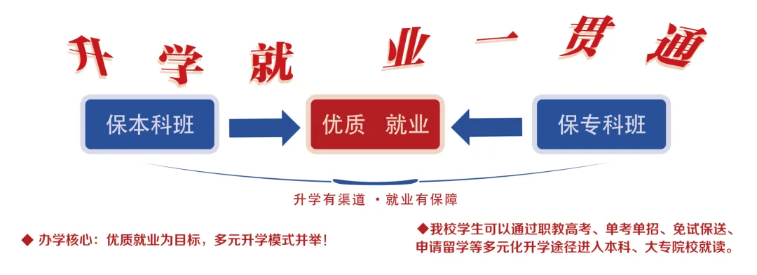 学生可在我校就读升学班,通过职教高考、中高职贯通、单招/对口升学、免试保送、申请留学等多元化升学途径升入本科、专科院校就读深造,与普通高中升入大学待遇完全一致,学生毕业发放教育部电子注册统招大专或本科毕业证。