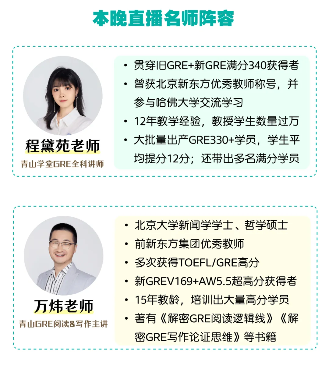 两位老师手把手带大家剖析本月的重点考题,讲清楚背后的本质考点和相应的解题方法。希望能帮助大家了解GRE考试出题套路、举一反三,在考场上用相同思路做对更多题目!基于本月GRE考试趋势,两位老师还会针对性的给大家提供接下来的备考建议:① 如果你是小白同学,你将收获一套最贴合目前GRE考试的备考详细规划