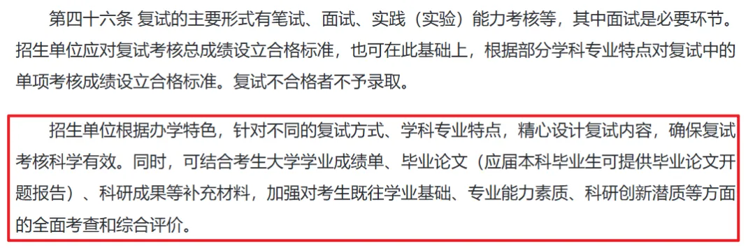 📑新规内容:复试不仅看学业知识和考试成绩,还需重点考察专业能力素质、科研创新潜质,以及考生一贯学业表现。