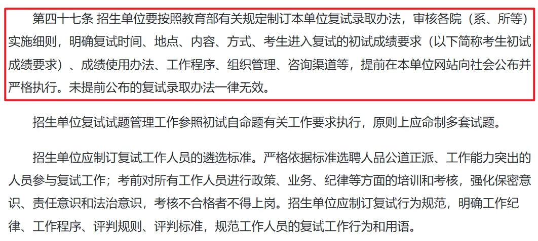 📑新规内容:招生单位必须提前在官网公布复试时间、地点、内容、方式、进复试成绩要求、成绩使用办法等所有关键信息,未提前公布的复试办法一律无效。