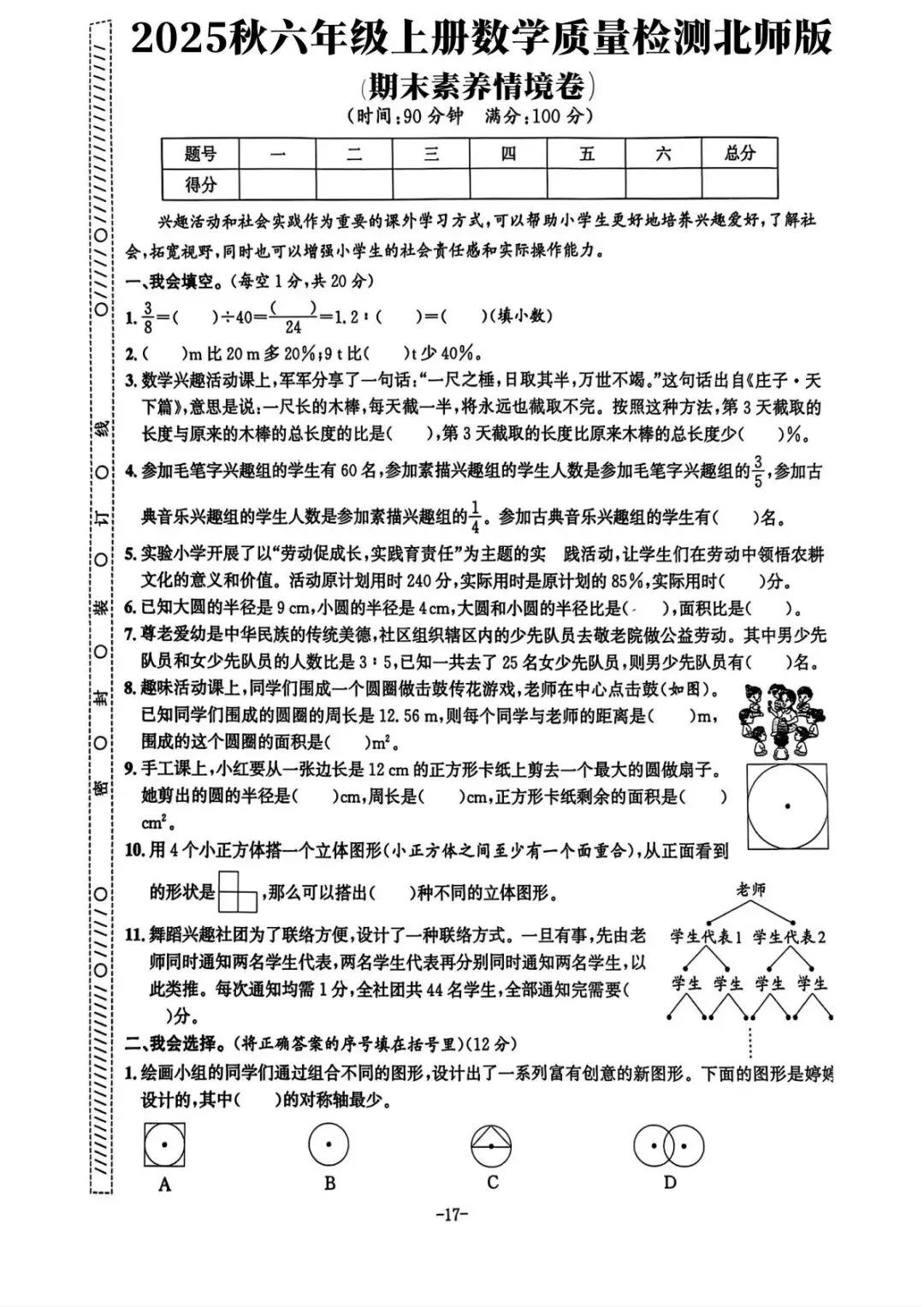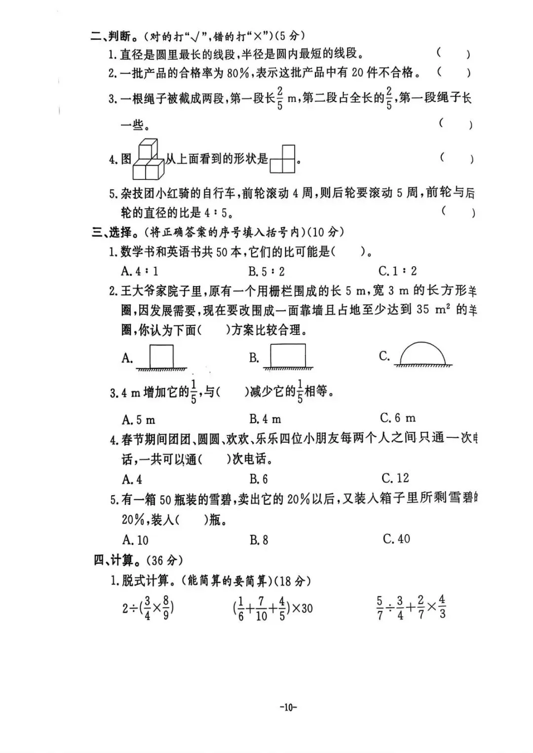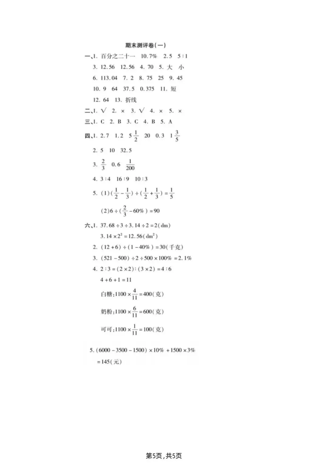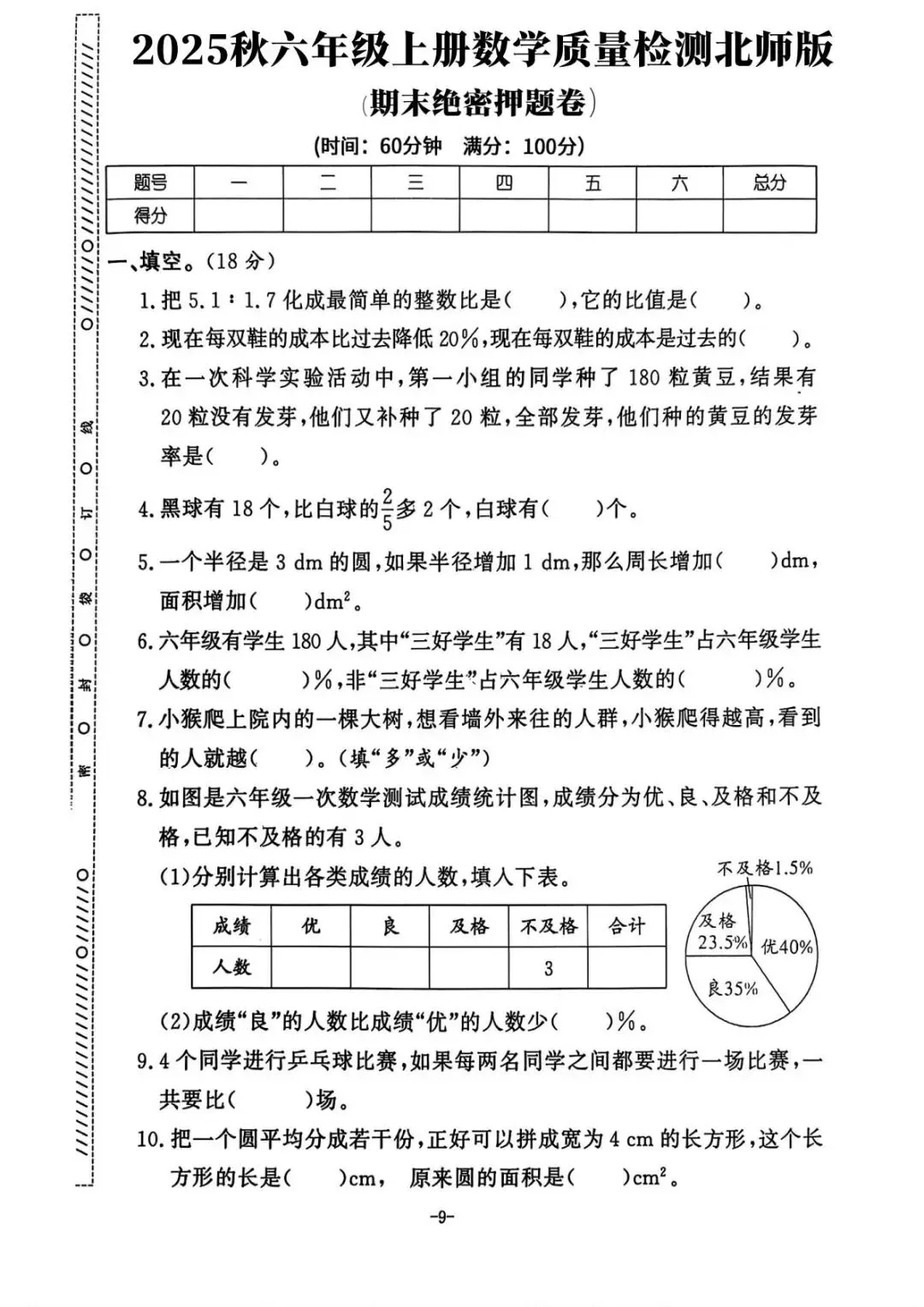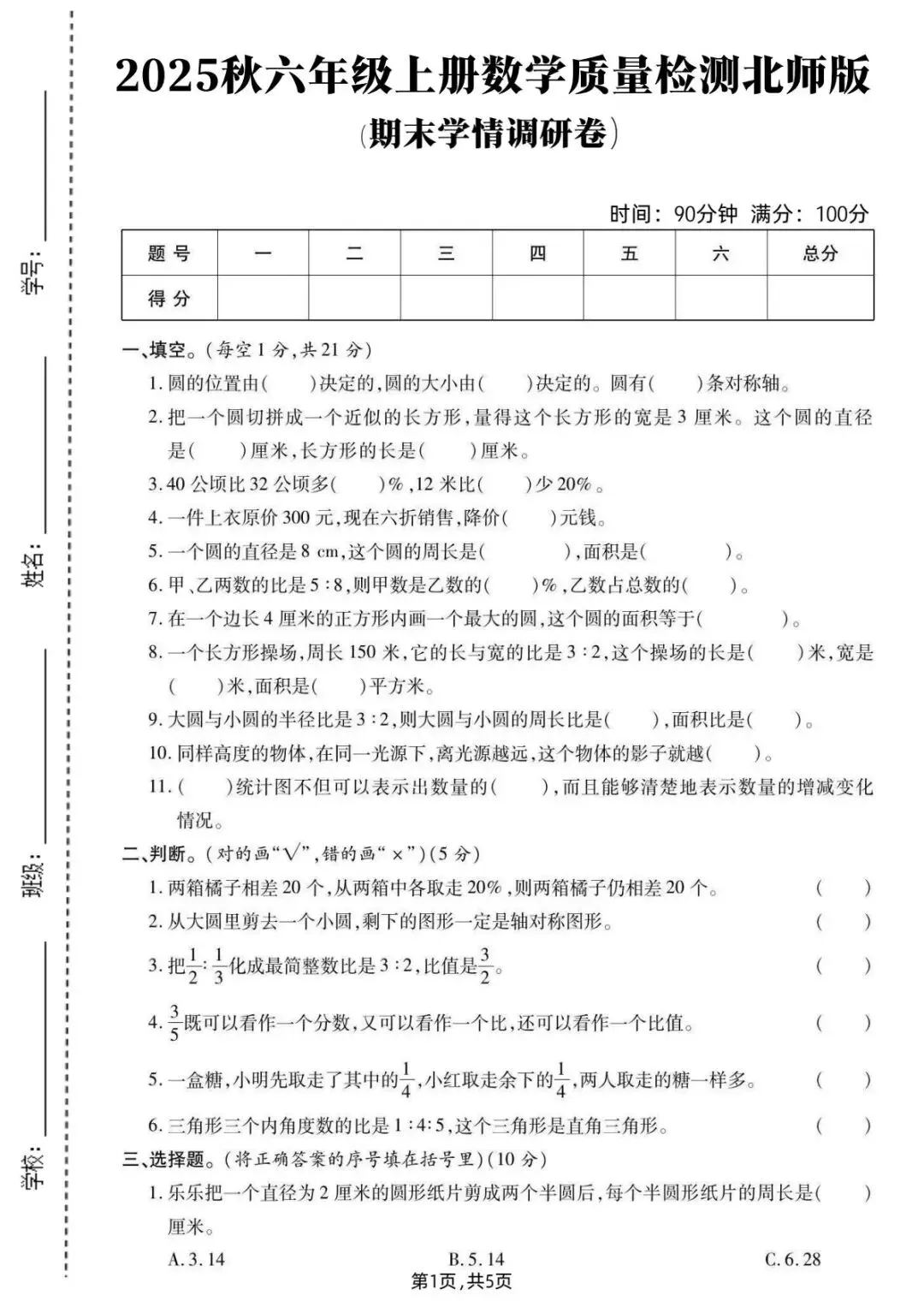 六年级上册北师大版数学期末考试冲刺试卷,共5套带答案,电子版可下载可打印,这份期末真题复习冲测试卷,既有基础夯实训练,也有分数混合运算、百分数应用、圆的几何计算等难点突破练习,能够帮助孩子梳理知识体系,攻克薄弱环节,全面提升解题能力与应试技巧,高效备战期末数学考试。