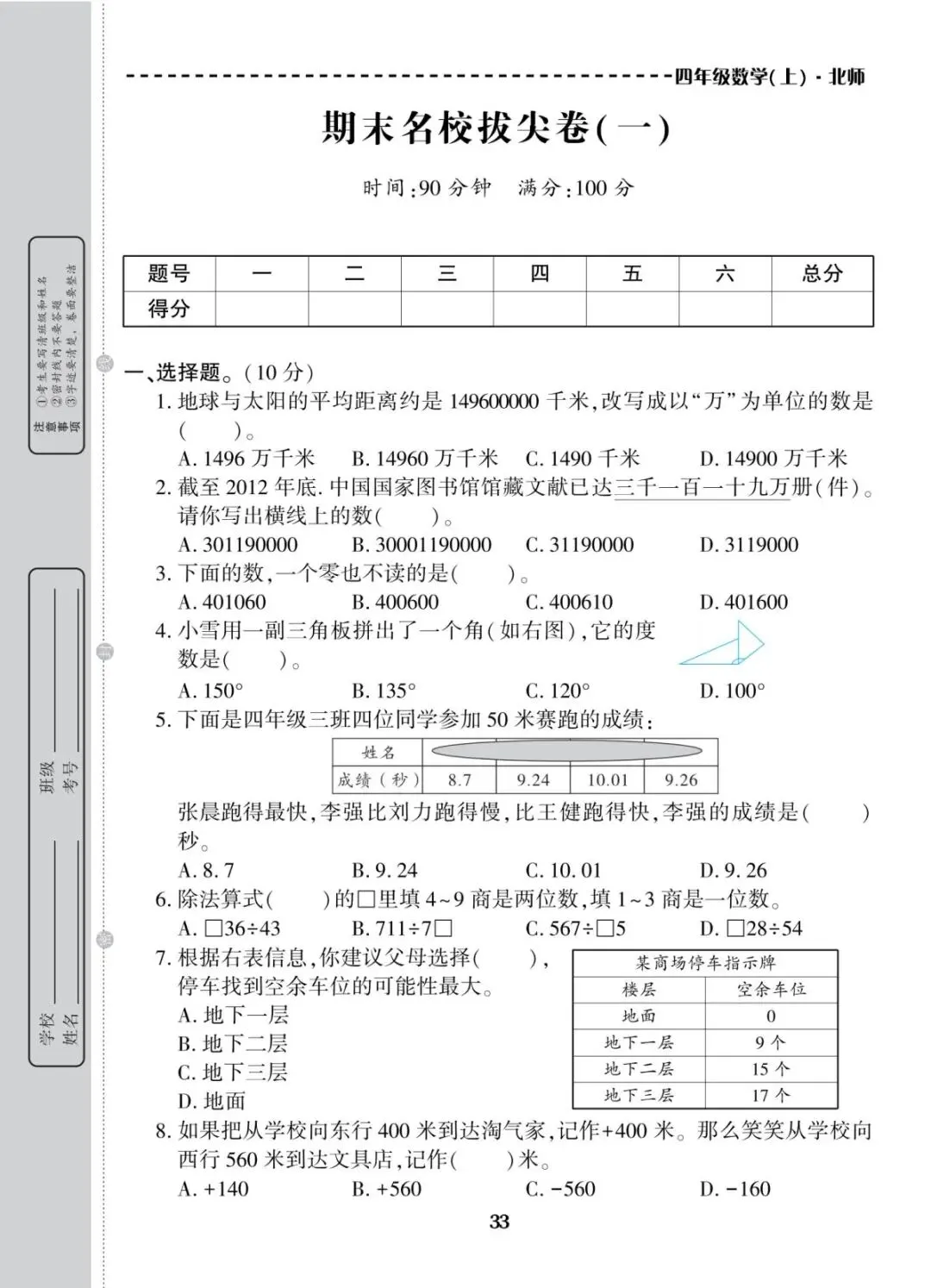 四年级上册北师大版数学期末考试冲刺试卷(共10套,含答案)