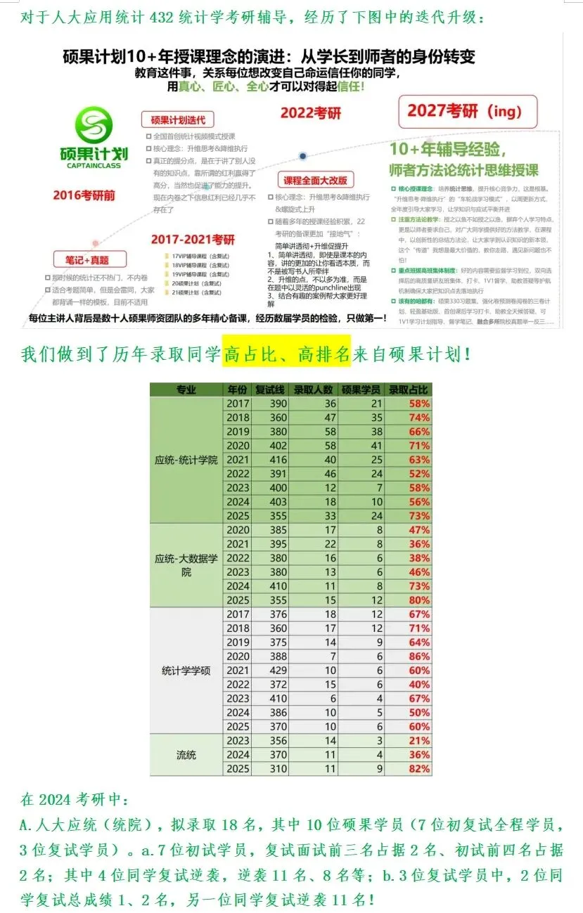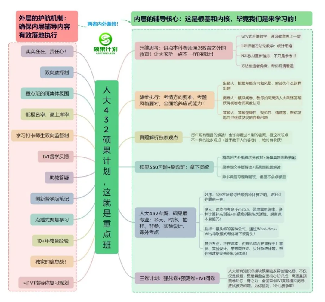 27硕果计划人大432版统计思维拔高班重磅升级推出!今年硕果计划师资团队依旧秉持着每一年都不断精进打磨课程,而27硕果计划最大的亮点在于结合团队10+年考研辅导经验推出“内外兼修”的教学模式: