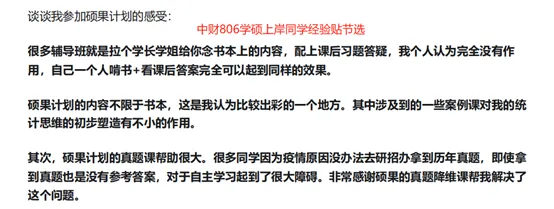 我们做到了人大应统&人大流统&人大大数据学院应统&人大统计学硕录取同学70%~80%以上来自硕果计划!中财应统、贸大应统录取同学30%~50%以上来自硕果计划!贸大816统计学硕录取同学最新全部为硕果同学,贸大817统计学硕录取同学只有1位同学非硕果学员,北师应统硕果复试录取率87%以上,且每年均有初试总分Top学员!历年也帮助部分同学上岸中财学硕统计!而且均为初复试第一名的同学