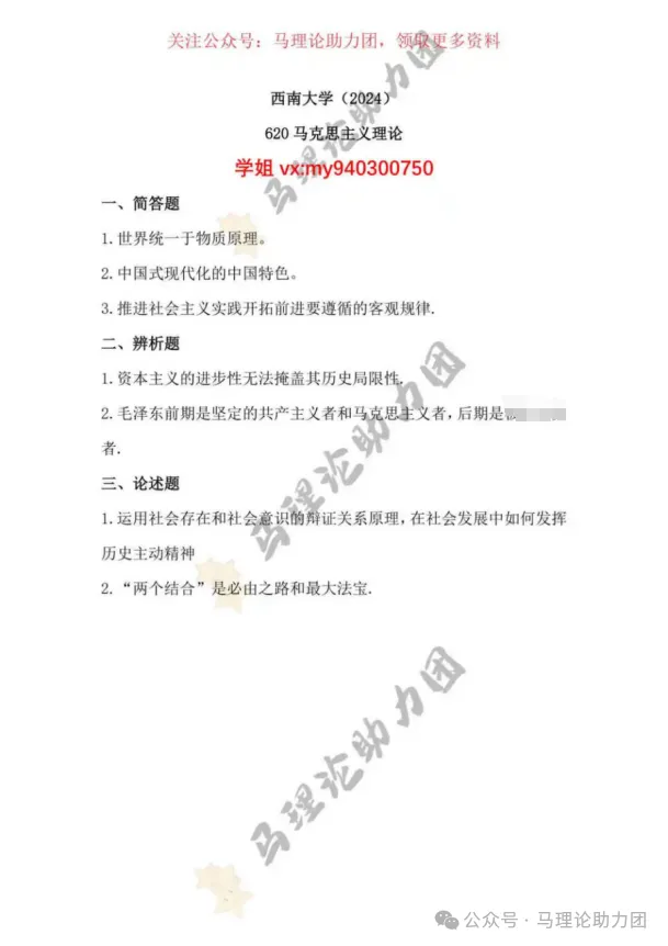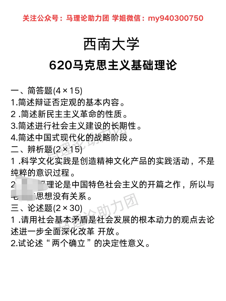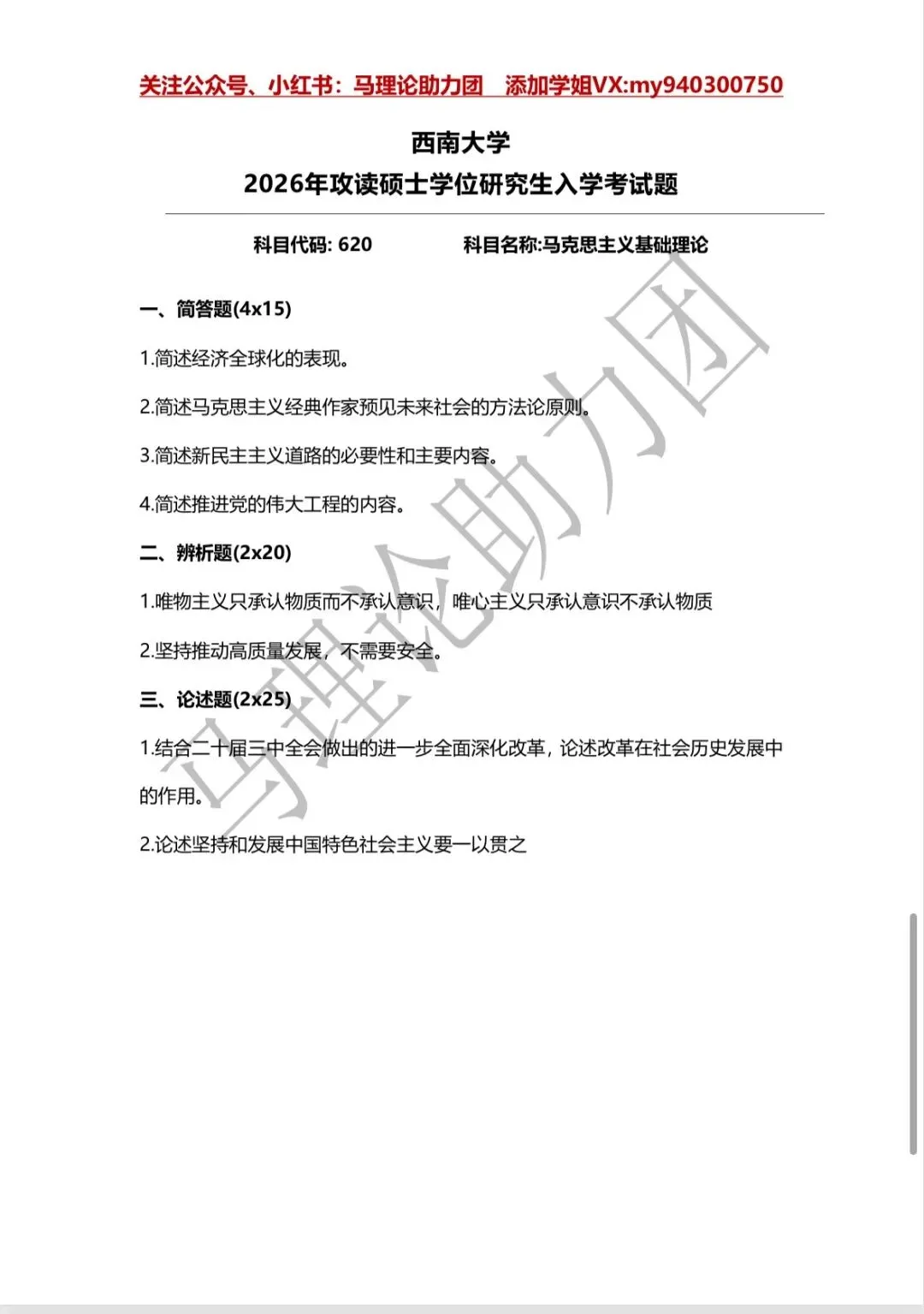专业课一(620 马克思主义基础理论)题型保持稳定,由简答、辨析、论述三类构成,题量设置合理,整体难度中等偏易。2026 年真题简答题聚焦经济全球化的表现、马克思主义经典作家预见未来社会的方法论原则等基础核心知识点,注重对原理的系统阐述;辨析题则围绕 “唯物主义与唯心主义的本质区别”“高质量发展与安全的关系” 等命题,考查对理论的辩证辨析能力;论述题紧密结合二十届三中全会 “进一步全面深化改革” 的时政热点,要求考生运用社会历史发展规律分析改革的作用,并对 “坚持和发展中国特色社会主义要一以贯之” 进行深度论证,强调理论与现实的结合。