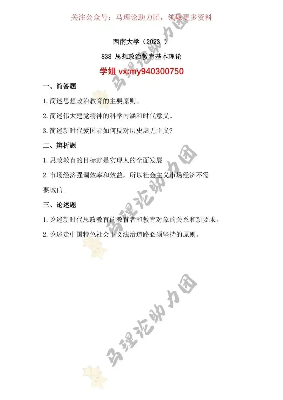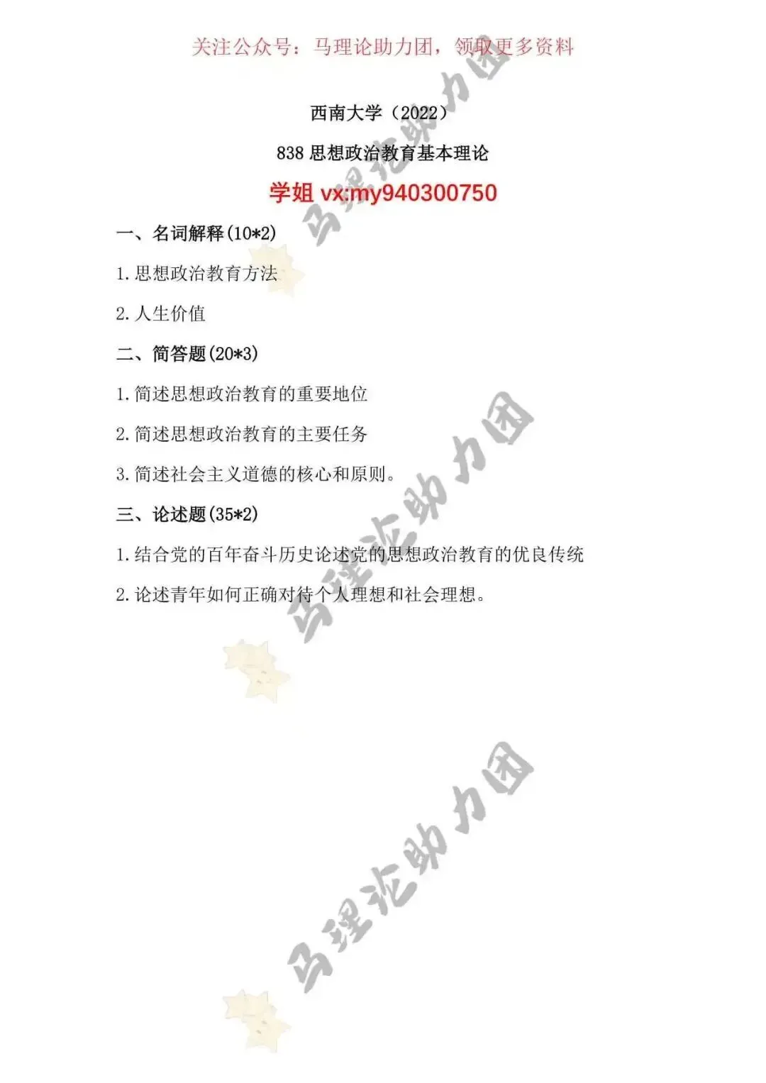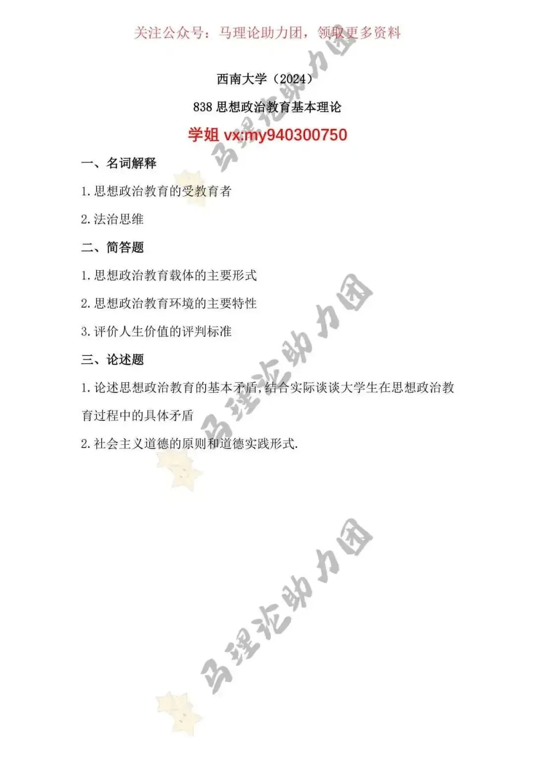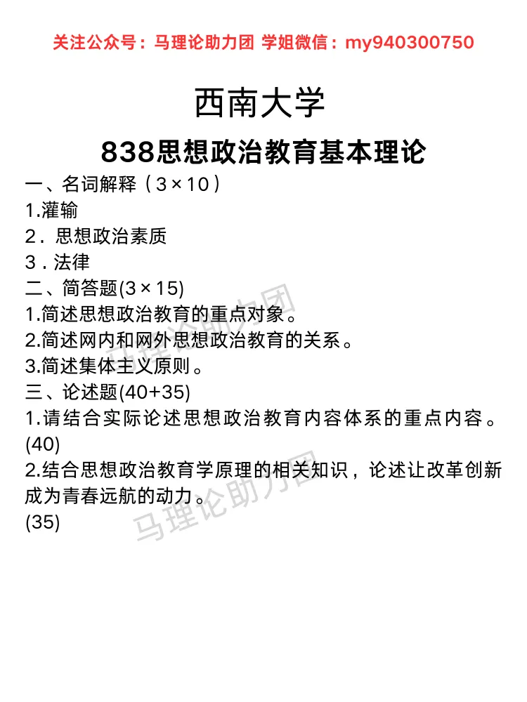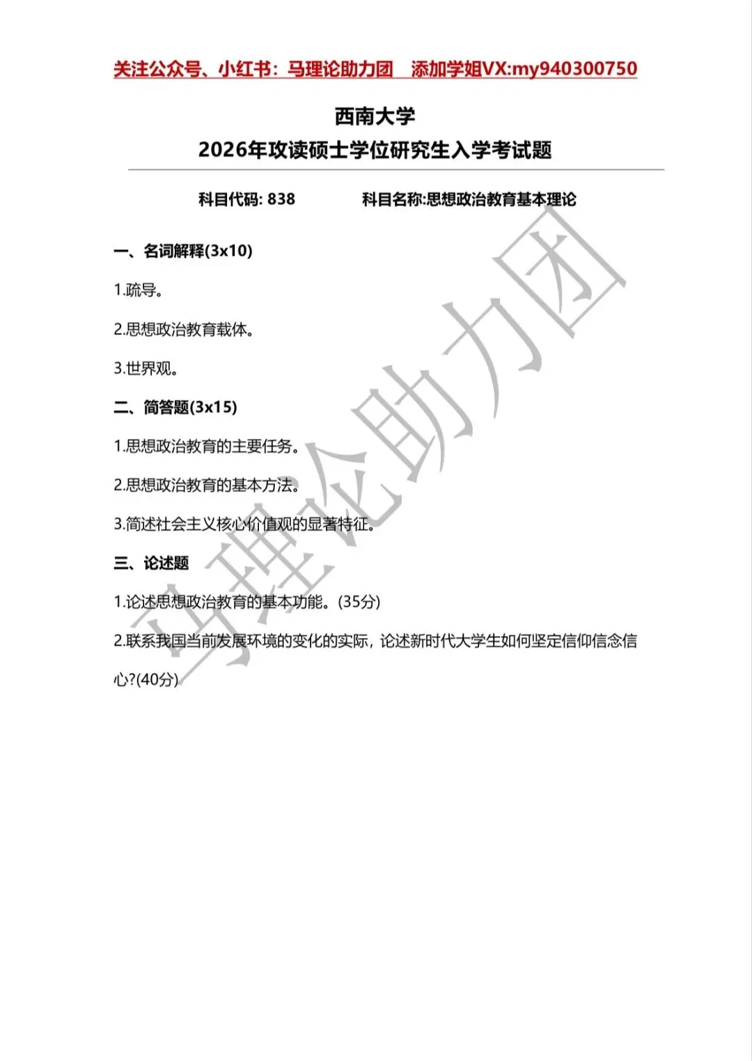 复习建议:需系统梳理教材知识体系,深化对思想政治教育基本范畴、原理与方法的理解;同时关注青年成长与社会现实问题,加强理论联系实际的训练,提升理论应用与综合论述能力。