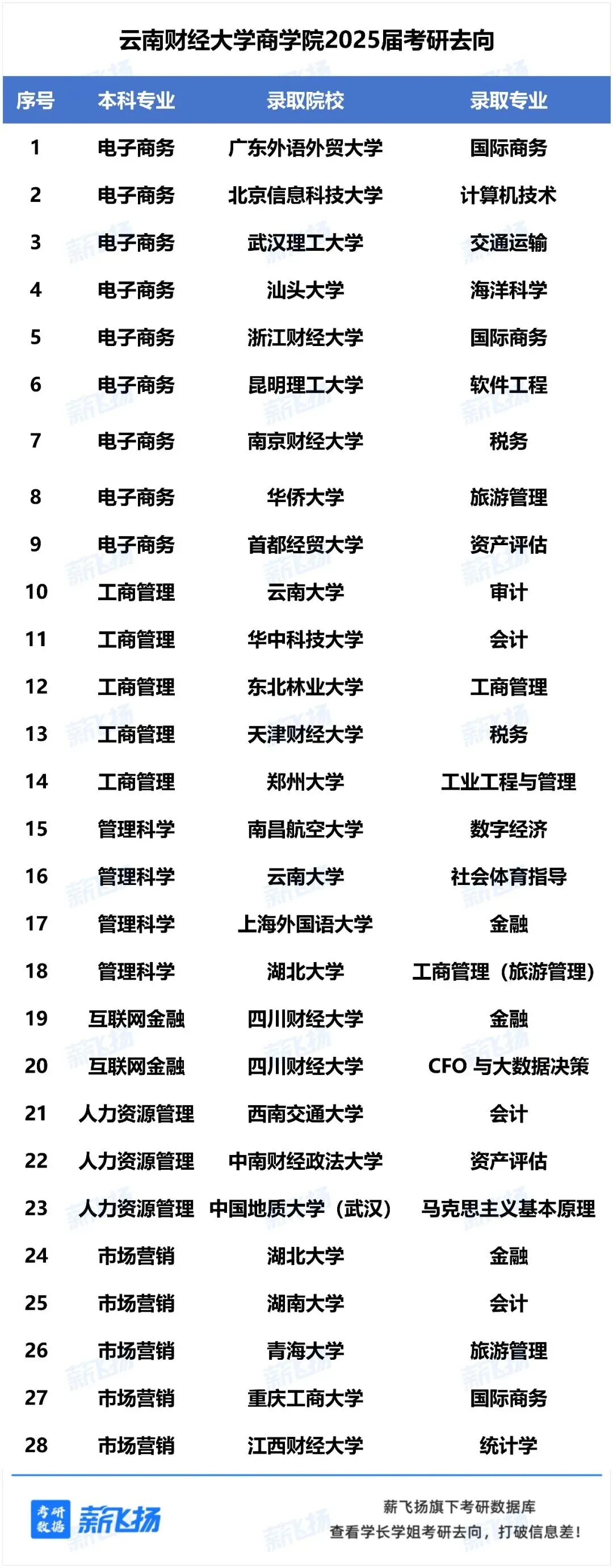 云南财经大学商学院2025届考研去向呈现明显的多元化特征。电子商务、工商管理等专业学生升学方向广泛,跨考现象普遍,涉及国际商务、计算机、交通运输、金融、会计等多个领域。录取院校层次多元,既有985/211高校,也有财经类特色院校。整体体现商科学生基于兴趣与就业的灵活选择。