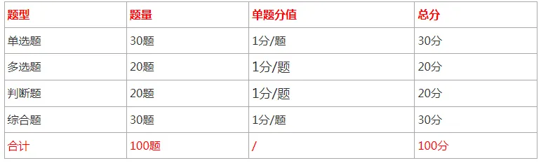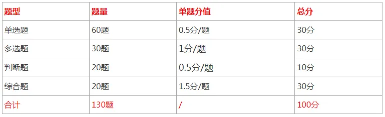 1. 《期货基础知识》科目:共130道题目 单项选择题:60道,每道0.5分,共30分; 多项选择题:30道,每道1分,共30分; 判断是非题:20道,每道0.5分,共10分; 综合题:20道,每道1.5分,共30分 2. 《期货法律法规》科目:共130道题目 单项选择题:60道,每道0.5分,共30分; 多项选择题:30道,每道1分,共30分; 判断是非题:20道,每道0.5分,共10分; 综合题:20道,每道1.5分,共30分3. 《期货投资分析》科目:共100道题目 单项选择题30道,每道1分,共30分; 多项选择题20道,每道1分,共20分; 判断是非题20道,每道1分,共20分; 综合题 30道,每道1分,共30分。