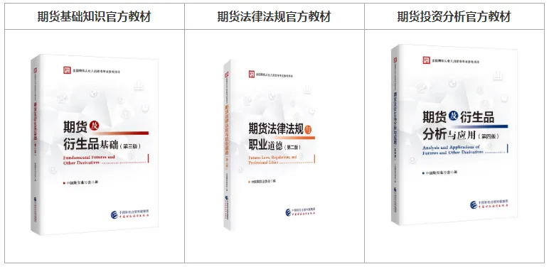 《期货法律法规》科目采用的官方教材为《期货法律法规与职业道德(第二版)》;《期货基础知识》科目采用的官方教材为《期货及衍生品基础(第三版)》;《期货投资分析》科目采用的官方教材为《期货及衍生品分析与应用(第四版)》。