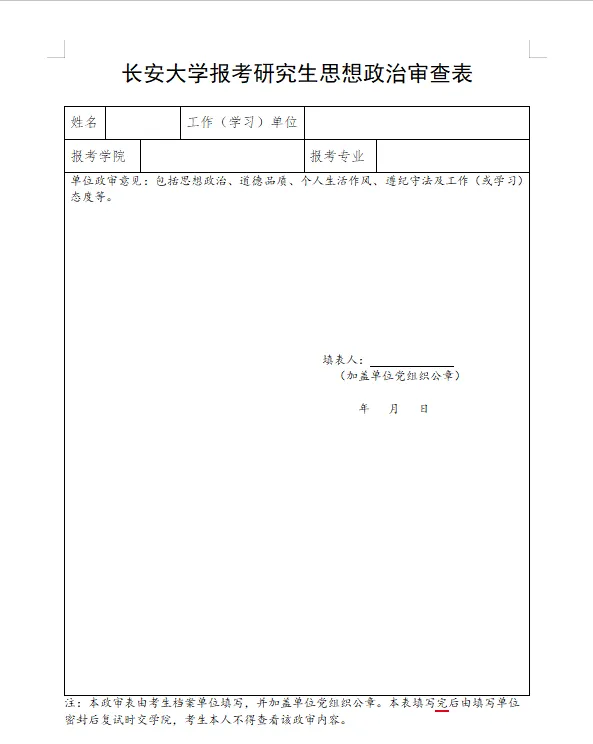 ⑤政治审核表,具体格式和提交要求以报考院校通知为准;(以长安大学为例)