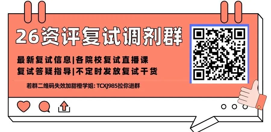 扫描下方二维码,添加甜橙学姐:TCXJ985回复“调剂早鸟”立即领取资料包+获取1V1调剂规划咨询