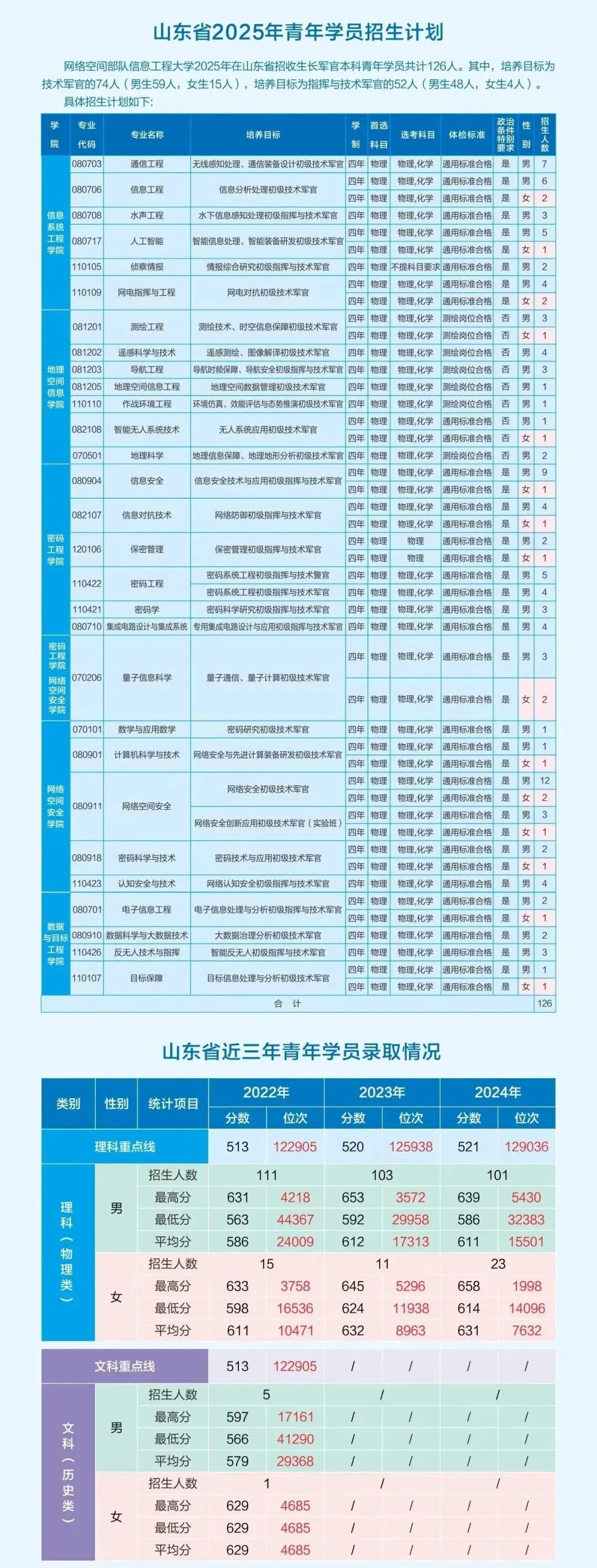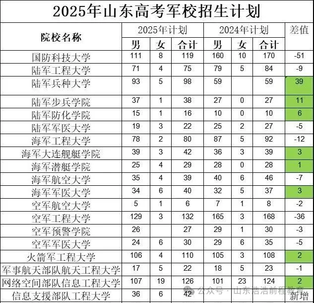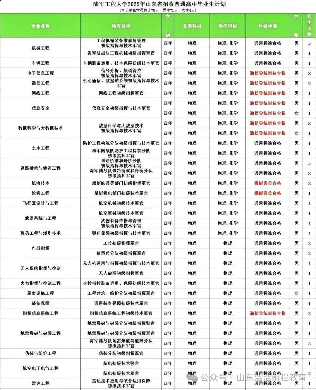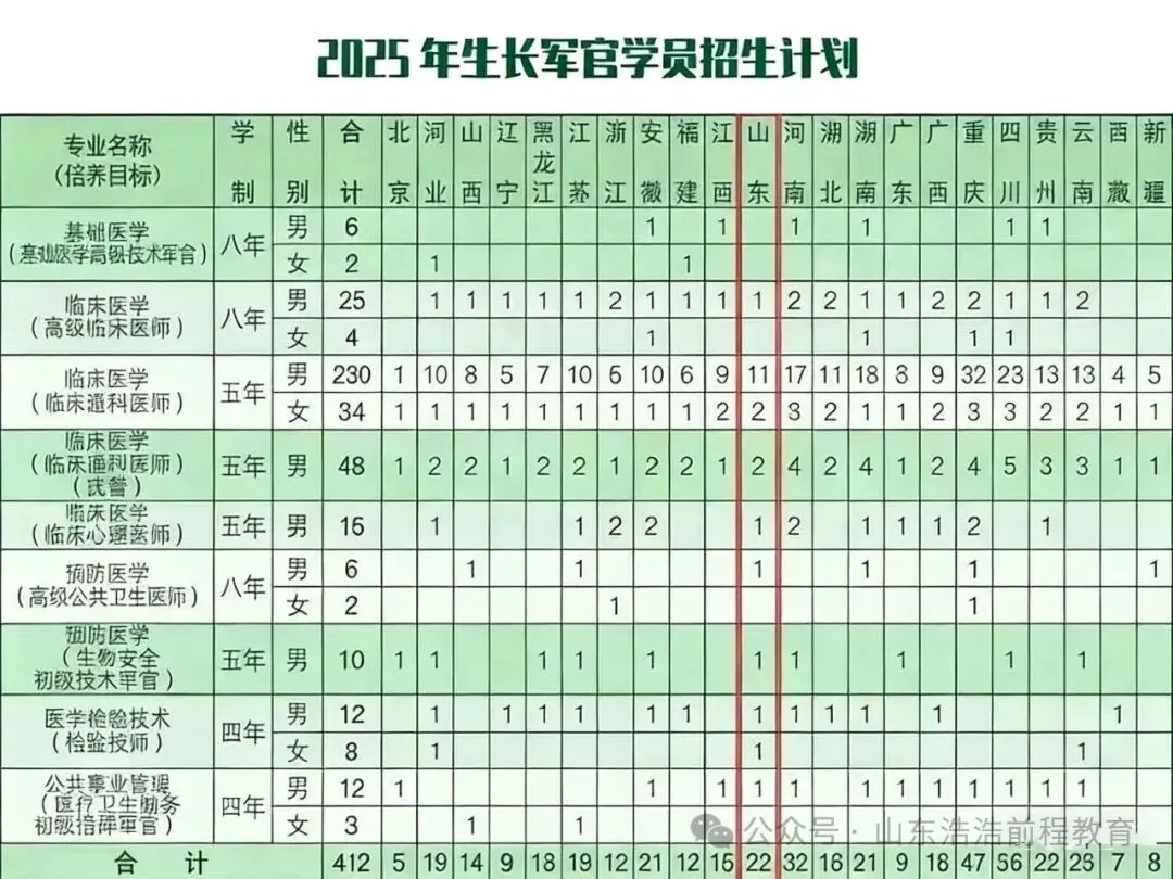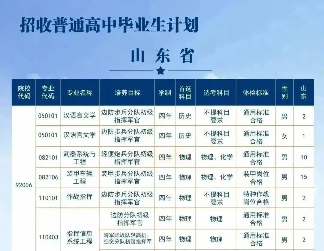 2025年全军22所军校在山东共投放招生计划1250人,整体规模稳定,为考生提供了充足的录取机会 。其中男生计划1156人,女生计划94人;
