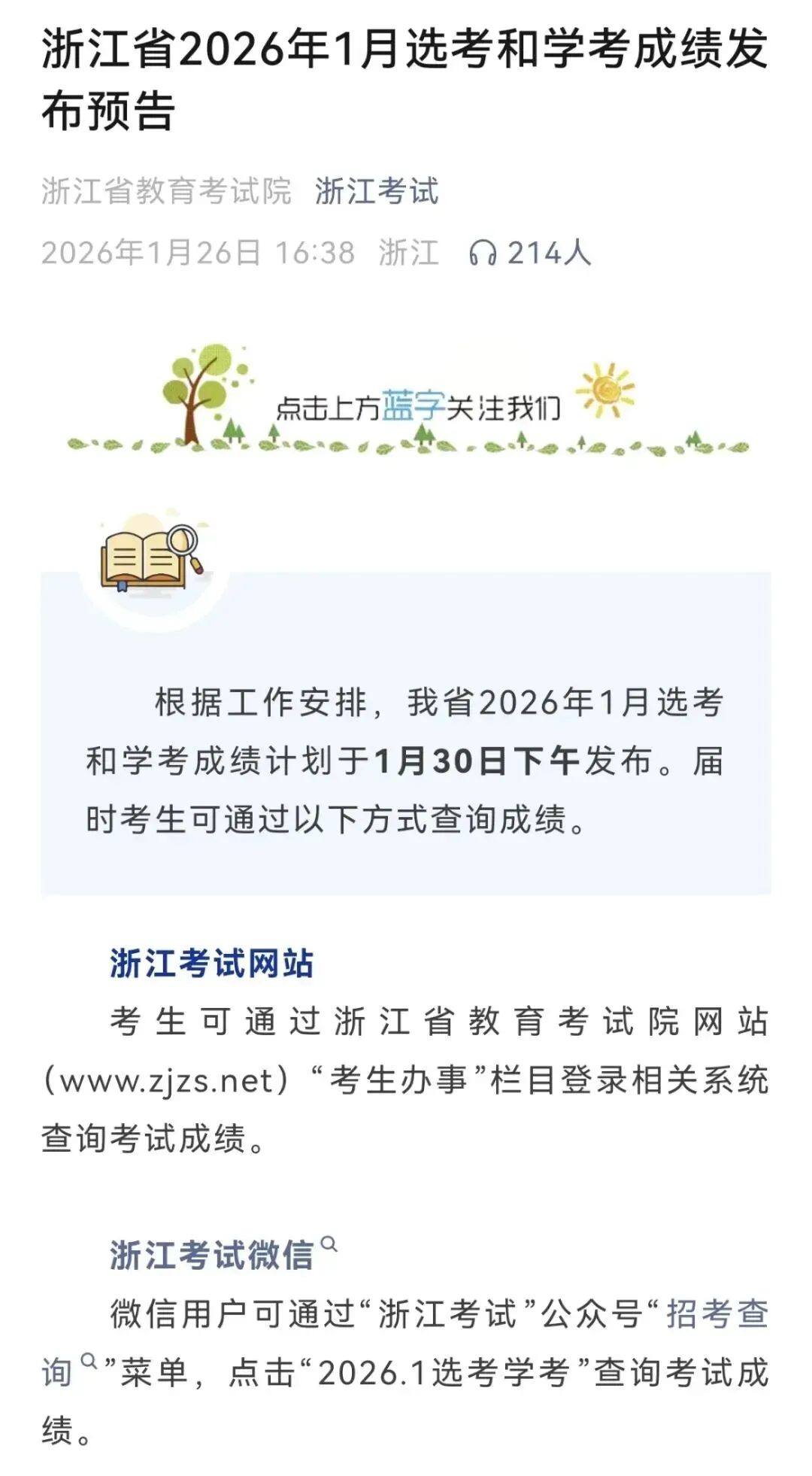 🔹 方式一:浙江考试网站考生可登录浙江省教育考试院官网(www.zjzs.net),进入「考生办事」栏目,登录相关系统即可查询成绩。🔹 方式二:浙江考试微信公众号微信用户关注「浙江考试」公众号,点击菜单栏「招考查询」,选择「2026.1选考学考」即可查询。
