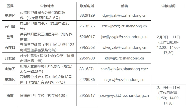 各区县(功能区)卫生健康行政部门应对所辖机构报送的材料予以复核,汇总整理后,于 2 月 11 日前将一下材料发送至邮箱 rzswjwyzk@rz.shandong.cn:1.本辖区考生报名汇总表excel和盖章后扫描形成PDF格式;2.考生相关证明资料PDF文件 。未按时报送考生报名汇总表的医疗卫生机构,其考生报考资料不予受理审核,由此造成考生不能正常报考的责任由该机构承担。