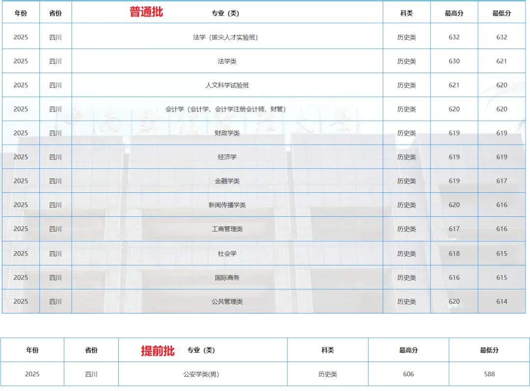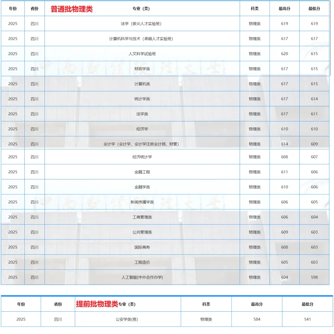 2025年在四川新增“法学(拔尖人才实验班)、人文科学试验班、计算机科学与技术(卓越人才实验班)、人工智能(中外合作办学)”等专业,其中“人文科学试验班”可根据考生个人兴趣分流选择进入学校任一专业;学校有多个“拔尖人才实验班”和“卓越人才实验班”,均属于学校的“希贤计划”,“拔尖人才实验班”学生100%保研,“卓越人才实验班”保研率不低于30%。 本科提前批A段公安、司法物理类设1个专业组,含“公安学类”1个专业,只招男生,再选科目要求为“思想政治”,录取分数为541,排名75327位次,物理组再选“思想政治”的考生偏少,且有身体条件要求,所以新高考首年录取分数不高;本科批B段物理类设3个专业组: