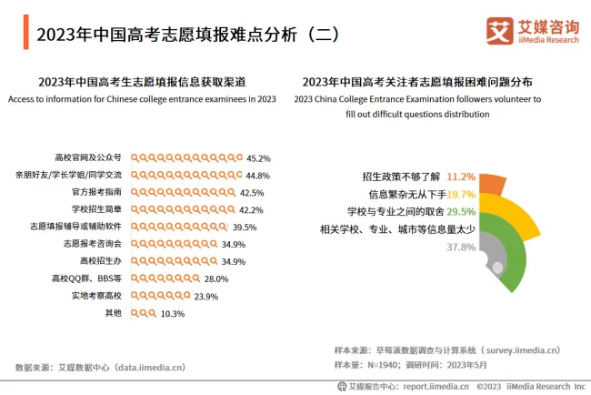 根据iiMedia Research(艾媒咨询)数据显示,高考生获取志愿填报信息主要以学校官网及公众号、亲朋好友/学长学姐/同学交流、官方报考指南等渠道为主;相关学校、专业、城市等信息量太少,学校与专业之间的取舍成志愿填报的难题。