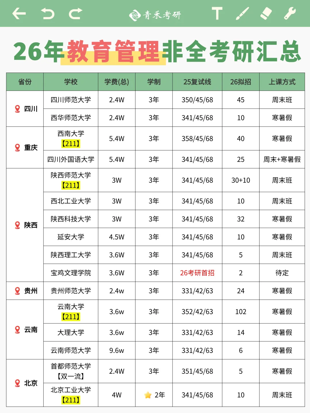 全国目前开设【教育管理】非全硕士研究生的共有98所高校,26考研招生规模达1825人,是整个非全教育硕士的大头,并且6大部署师范院校(西南大学、北师大、华东师大、华中师大、东北师大、陕西师大)都开设教育管理硕士,但是北京师范大学开设的仅全日制教育管理哦~