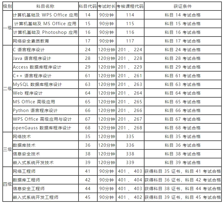2.从2022年9月考试起,新增二级openGauss数据库程序设计(科目代码68)。