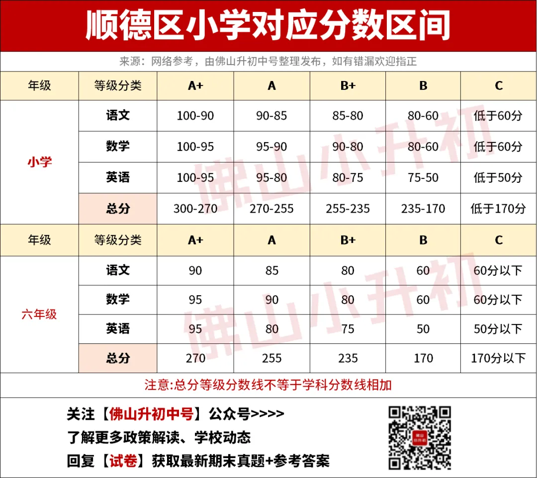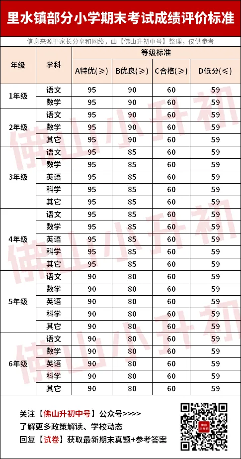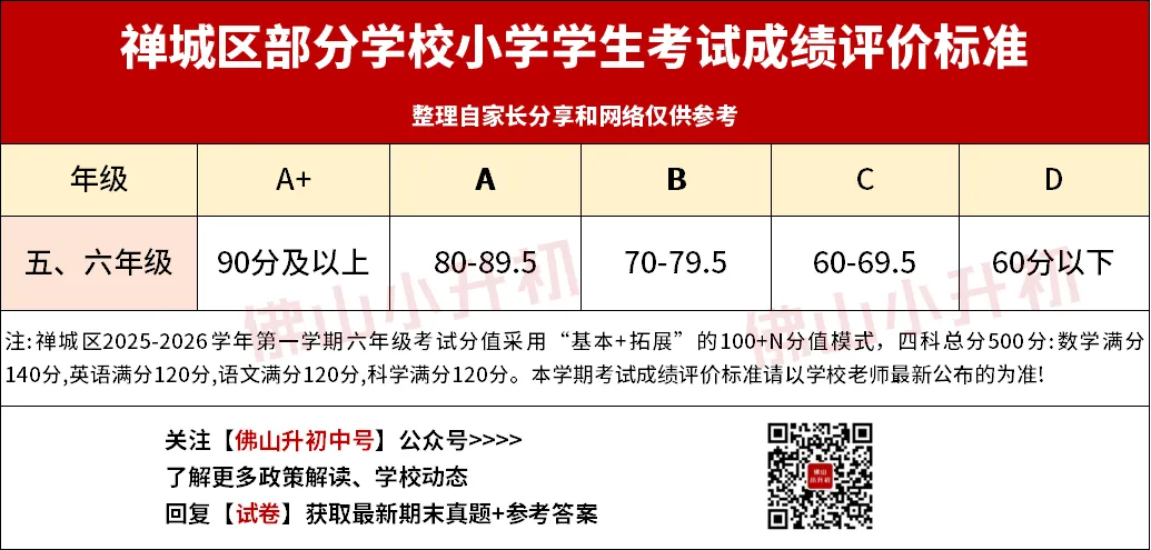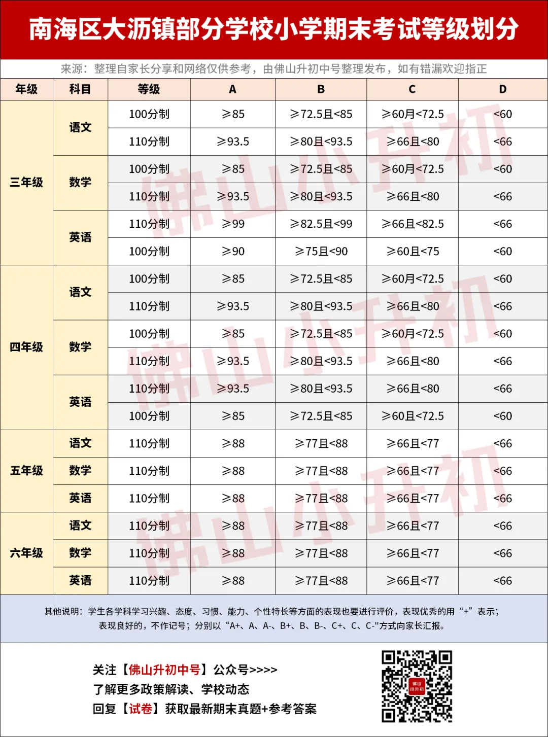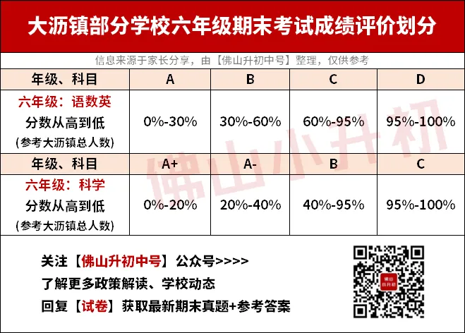 以下为部分学校往期考试成绩评价划分标准参考,部分小学不参加禅城区统考,期末总分和禅城区不一致,成绩等级划分也会有差异。