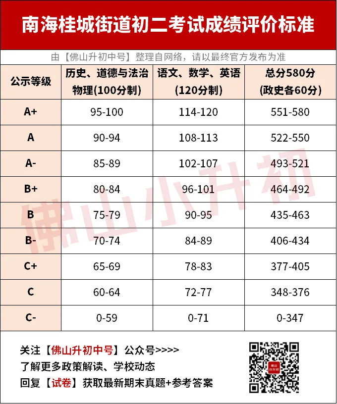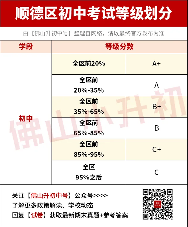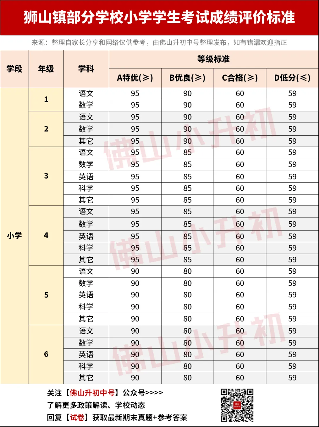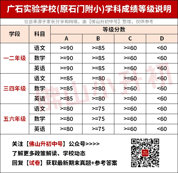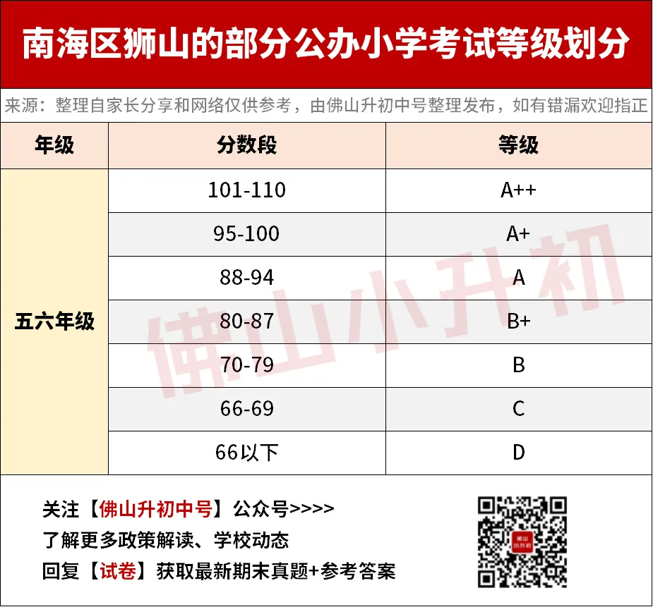以下为部分学校往期考试成绩评价划分标准参考,部分小学不参加禅城区统考,期末总分和禅城区不一致,成绩等级划分也会有差异。