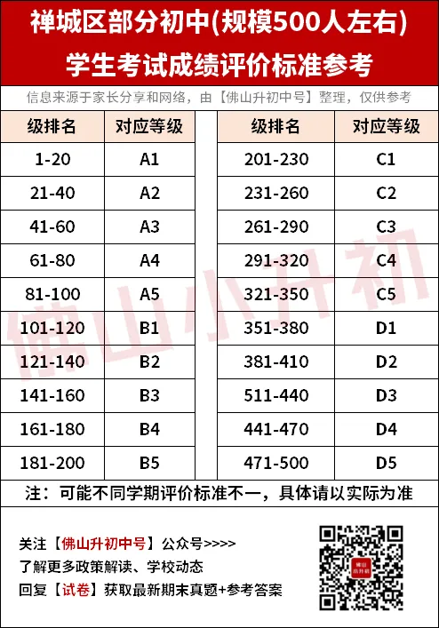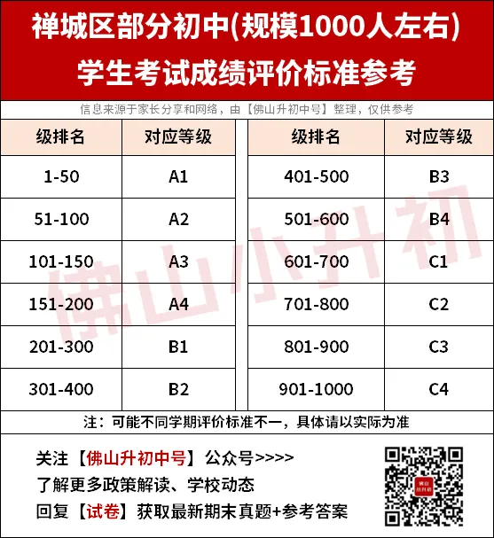 禅城区初中学生考试等级部分学校按照级排名对应不同等级。全年级总人数不同,级排名略有差别,以下仅为部分学校等级评价参考。