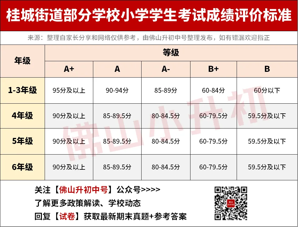 据桂城街道的家长分享,等级分为A+,A,A-,B+,B-五个等级:一到三年级:95分及以上为A+,90分及以上为A,85分及以上为A-,60分及以上为B+,60分以下为B;四、五、六年级为:90分及以上为A+,85分及以上为A,80分及以上为A-,60分及以上为B+,60分以下为B。