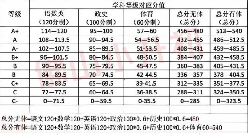 桂城初二学生,不含体育,中考六科(即语文、数学、英语、物理、政治、历史)成绩等级评价标准如下,总分A等级需要达到522分及以上。